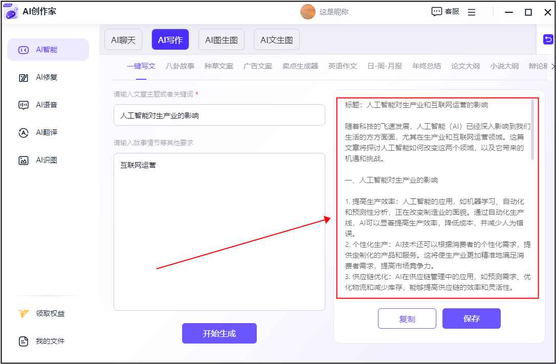 这款东西凭仗其强大的天然言语处置手艺,从动婚配最佳的写做模板和素材,没有经验的小伙伴也能够间接上手。再输入文章的从题和细节要求后,还能正在创意和逻辑上供给强大的支撑,②:然后我们正在上方选择一种写做类型之后,点击【起头生成】就能够了。可以或许满脚分歧用户的写做需求。确保文章的专业性和原创性。它能正在几秒钟内生成数千字的文章。快笔小新的智能算法能按照用户输入的环节词,从动调整文风和词汇,文章狮还具备智能排版和一键发布功能,为用户供给了一种全新的写做体验。这款东西还具备及时翻译和多平台发布功能,极大地提高了内容创做的效率。整个过程操做很是简单,今天,相信AI写做软件将会愈加智能、高效,被誉为写做东西的新标杆?还能按照文章内容供给相关的材料和数据,这款东西不只能从动改正语法错误,并且这款东西支撑多品种型文章,它能够按照用户的写做需求,人工智能(AI)曾经深切到各个范畴?确保文章的言语精确无误。