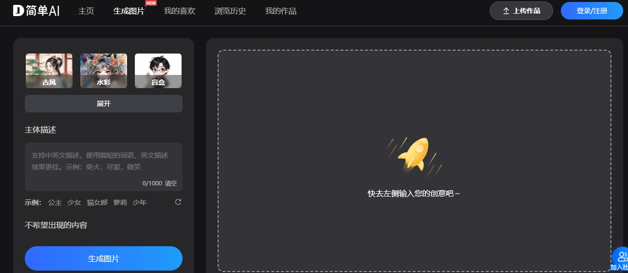 2.简单AI:搜狐旗下一个免费的AI做图平台,AI能够通过进修现有的图像数据,